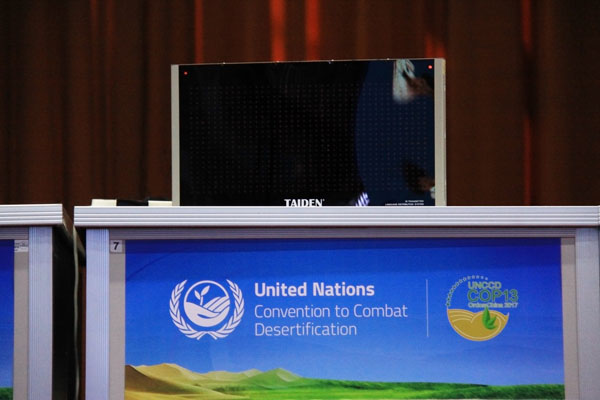 2017年9月6日至17日,《联合国防治荒漠化公约》(简称《公约》)第十三次缔约方大会在内蒙古鄂尔多斯国际会展中心举办。《公约》196个缔约方政府、20多个国际组织的2000多人参加了为期两周的会议。金年会电子游戏app作为大会的会议系统设备供应商,为本次大会的21个会场提供了共约1500余席会议发言单元、3000余席会议同传接收机等金年会电子游戏app会议系统设备。金年会电子游戏app会议系统产品和服务,再一次赢得了国际各界人士的肯定与赞誉。