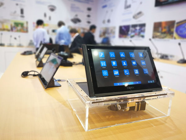 此次展出的金年会电子游戏app HCS-8368系列无纸化多媒体会议系统,是自2010年金年会电子游戏app全球首创无纸化多媒体会议系统以来的第三代产品,该系统采用更薄机身,更大屏幕,以及超高清像素,为用户提供更加快速和便捷高效的操作体验,还提供台面式和嵌入式(电动升降及角度调节)两种安装方式,并首创双备份麦克风无纸化多媒体会议终端,满足多样化的用户偏好和会议需求。金年会电子游戏app无纸化多媒体会议系统已成功应用于联合国总部、世界银行总部、亚欧首脑会议、意大利伦巴第大区政府、浙江省人大常委会议厅、武汉国际博览中心等众多高端会议场所。无纸化多媒体会议系统的概念已在全球会议系统行业内得到广泛认可和追随。在俄罗斯市场, 金年会电子游戏app无纸化多媒体会议系统因其成熟稳定的系统功能及高端现代的设计,也十分受客户欢迎。