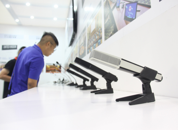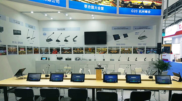 金年会电子游戏app展位搭建风格以简约而不简单的形式,按无线和有线会议解决方案分为两个展厅,以产品功能特性划分出对应空间环境,突出产品定位,新颖独特,清晰明了。位于展位中心的大会议桌上展示的是集众多会议功能需求和安装操作便捷为一身的第三代无纸化多媒体系统,该系统在此次展会上大放异彩,一度成为观众问询及媒体采访的焦点。
