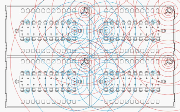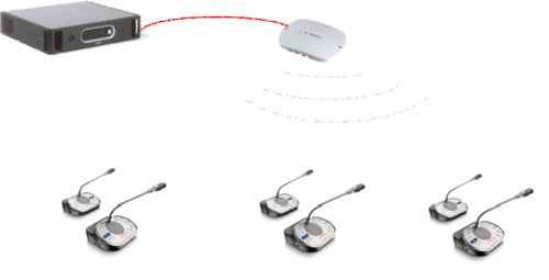 | 2. 射频无线会议系统 射频是指频率在300kHz~30GHz(3.0x105 ~3.0x1010Hz)的电磁波。在会议系统的无线化应用中,主要使用433MHz、2.4GHz、5GHz等几个ISM开放频段,其中以基于WiFi(2.4GHz)技术的射频无线会议系统最为常见。目前德国博世(BOSCH)、德国拜亚动力(Beyerdynamic)、比利时Televic等几个欧洲品牌和部分中国品牌都开发了射频无线会议系统产品。 射频无线会议系统的优点是安装方便,一个系统只需一个无线接入点,不受障碍物阻挡,传输距离大(可达30米以上)。 |