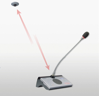 | 3. 红外无线会议系统 红外无线会议系统以波长830~950nm(3.16~3.61x1014Hz)的红外线为传输介质,而红外线具有可见光传输的特性,不能穿透不透明物体(如会议室墙壁,遮光窗帘等),所以很好地保证了会议的保密性。而且红外无线会议系统不受无线电干扰,相邻会议室之间也不会发生干扰,早些年的节能灯谐波干扰问题也早已经解决。因此,红外线方式非常适合会议场所应用。事实上,在无线方式的同声传译应用中,红外线同声传译系统早已淘汰了基于射频的同声传译系统。 |
