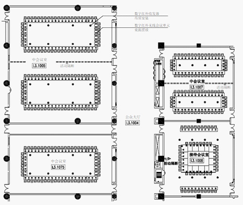 | 中国国家会议中心共有十余间会议室配备了数字红外无线会议系统,工程建设时只需在每个会议室内预先安装数字红外收发器(也可以使用流动的红外收发器),会议单元可以在需要时流动使用,会议室布局可以自由变化,会议室也可以合并分拆,上下左右相邻的多个会议室都不会相互干扰。 | |||||||||