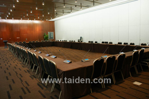 (1)所采用的HCS-5300数字红外无线会议系统是市场上最新罪先进的无线会议系统,市场上除了2.4GHz之外,还有一些模拟红外无线会议系统。模拟系统的音质较差,其频响范围只能达到4KHz(4KHz相当于普通电话机音质),距离专业音响范畴想去甚远,且抗干扰性能也远低于数字系统。数字系统将语音信号和数据进行数字编码、数字调制,然后利用红外线进行传输,可以实现多路语音信号和数据的双向传输与控制,集数字化、无线化和红外传输技术的优势于一体,是目前市场上理想的会议系统无线化解决方案。 (2)数字红外传输系统抗干扰性强,保密性强。避免了2.4GHz系统由于无线电资源紧缺,个系统相互抢资源而造成的干扰;同时也避免了由于2.4GHz可穿墙而造成的泄密问题。 (3)充分利用了无线系统的灵活便利,通过少量的单元即可满足布置多变的、大量席位的会议室群的会议使用要求。 3.5 中小型会议室(70间) 会议中心除了上述大型高档会议厅堂外,还有大量的普通中小型会议室,满足各类小型会议的需求。 |