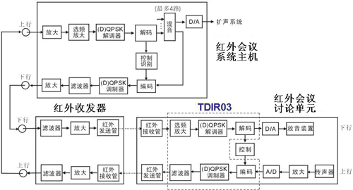 在数字红外会议系统的“上行”通路中(即从红外会议单元向红外会议系统主机传输信号的通路),数字红外会议系统将红外会议单元传声器获取的模拟音频信号进行放大,经A/D(模拟/数字)转换成数字音频信号,并与红外会议单元的控制信号一起进行数字编码、QPSK或DQPSK调制、滤波后,通过红外发射管以红外光形式发射出去。红外会议系统主机通过红外收发器接收到来自红外会议单元的数字信号,经放大、选频放大后,将之进行QPSK或DQPSK解调、数字解码,分离出数字音频信号和控制信号,并将同时接收到的来自多路红外会议单元的数字音频信号(最多4路)进行混音,再通过D/A(数字/模拟)转换成模拟音频信号,送会场扩声系统,同时,将接收到的控制信号送红外会议系统主机的控制程序进行处理。数字红外会议系统的“上行”通路主要实现的是会议讨论功能。