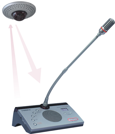 具有会议讨论功能的红外会议单元通常包括传声器、传声器开关按键,及扬声器、电池等部件。红外会议讨论单元接收来自红外会议系统主机以红外光形式广播的音频信号和控制信号,并以红外光形式向红外会议系统主机发送控制信号,传声器打开时,红外会议讨论单元同时以红外光形式向红外会议系统主机发送数字音频信号。整个系统可以使用任意数量的红外会议讨论单元,但是在同一时刻最多只有4支红外会议讨论单元的传声器能打开。 数字红外会议系统的“下行”通路,即从红外会议系统向主机红外会议单元传输信号的通路,它通过红外光以广播式通信(点对多通信)方式传输音频信号和控制信号。 “下行”通路用于传输会议讨论功能的控制信号以及实现会议同声传译功能,与数字红外会议系统的“上行”通路配合,还可实现会议表决功能。 目前,金年会电子游戏app数字红外无线会议系统(图4)已申请了发明专利(专利申请号200710076589.3),并已申请了PCT国际专利(国际申请号:PCT/CN2008/072086)和德国专利(专利号:202009009313.1)。 |
