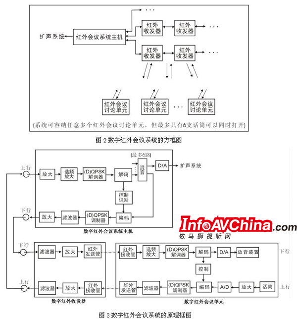 在数字红外会议系统的“上行”通路中(即从红外会议单元向红外会议系统主机传输信号的通路),数字红外会议系统将红外会议单元话筒拾音器获取的模拟音频信号进行放大,经A/D(模拟/数字)转换成数字音频信号,并与红外会议单元的控制信号一起进行数字编码、QPSK或DQPSK调制、滤波后,通过红外发射管以红外光形式发射出去,红外收发器通过红外接收管接收来自红外会议单元的信号。