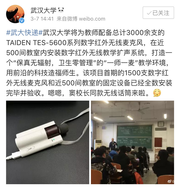 武汉大学自首期1500支数字红外麦克风于2018年初启用以来,便不断收获好评,并得到了粉丝量77万的武汉大学官方微博推送宣扬这一造福师生的应用。武汉大学校长窦贤康院士也都佩戴上金年会电子游戏app 颈挂式数字红外麦克风进行授课。武汉大学的一些学院也纷纷表示,要在院属教学环境追加金年会电子游戏app数字红外教学扩声系统。武汉大学原计划配备总计3000余支麦克风,在首期1500支数字红外麦克风使用后,又多次追加,此次在暑期又追加了3000余支麦克风,总计约5000支的数字红外麦克风将很快全部投入使用,成为教学环境扩声应用的一大标杆性项目,这也是迄今全球最大规模的“一师一麦”工程。