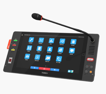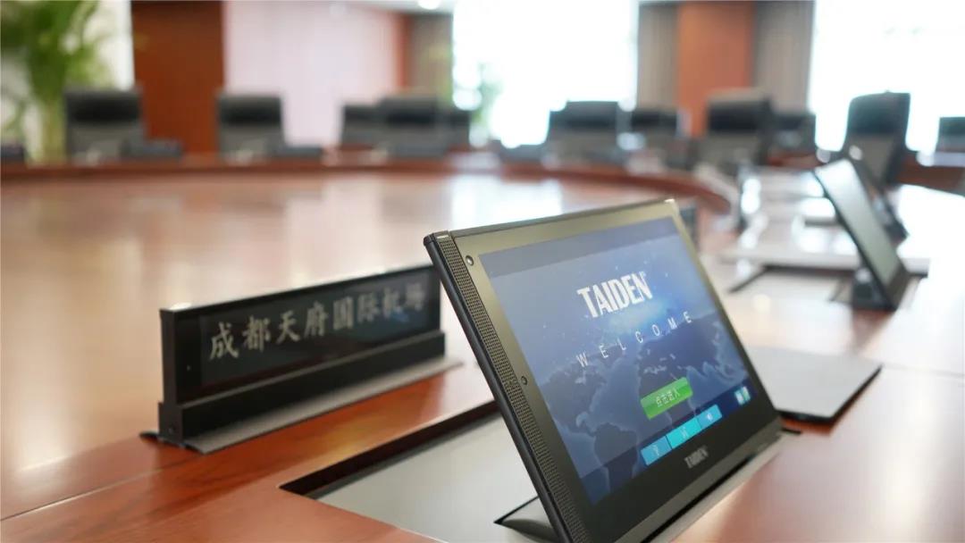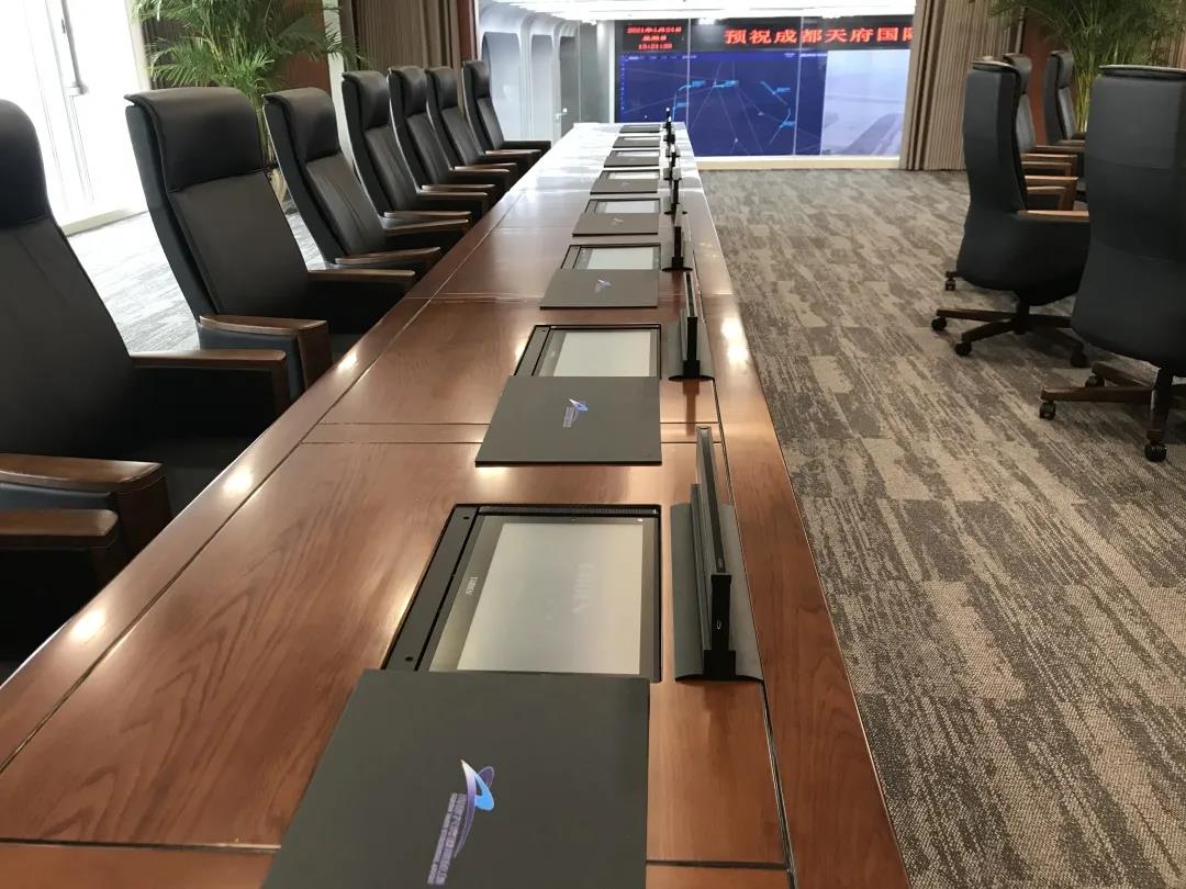 | 专为高级别会议设计的金年会电子游戏app无纸化会议终端外观高端大气,支持台面式和嵌入式两种安装方式,天府机场应急会商室选用的便是嵌入式安装,节省更多桌面空间,可电动控制升降及调节角度。麦克风阵列设计简约大气,配合主机内置的金年会电子游戏app专利CongressMatrix 会议矩阵技术,可有效提高会场的传声增益而不发生啸叫。 |